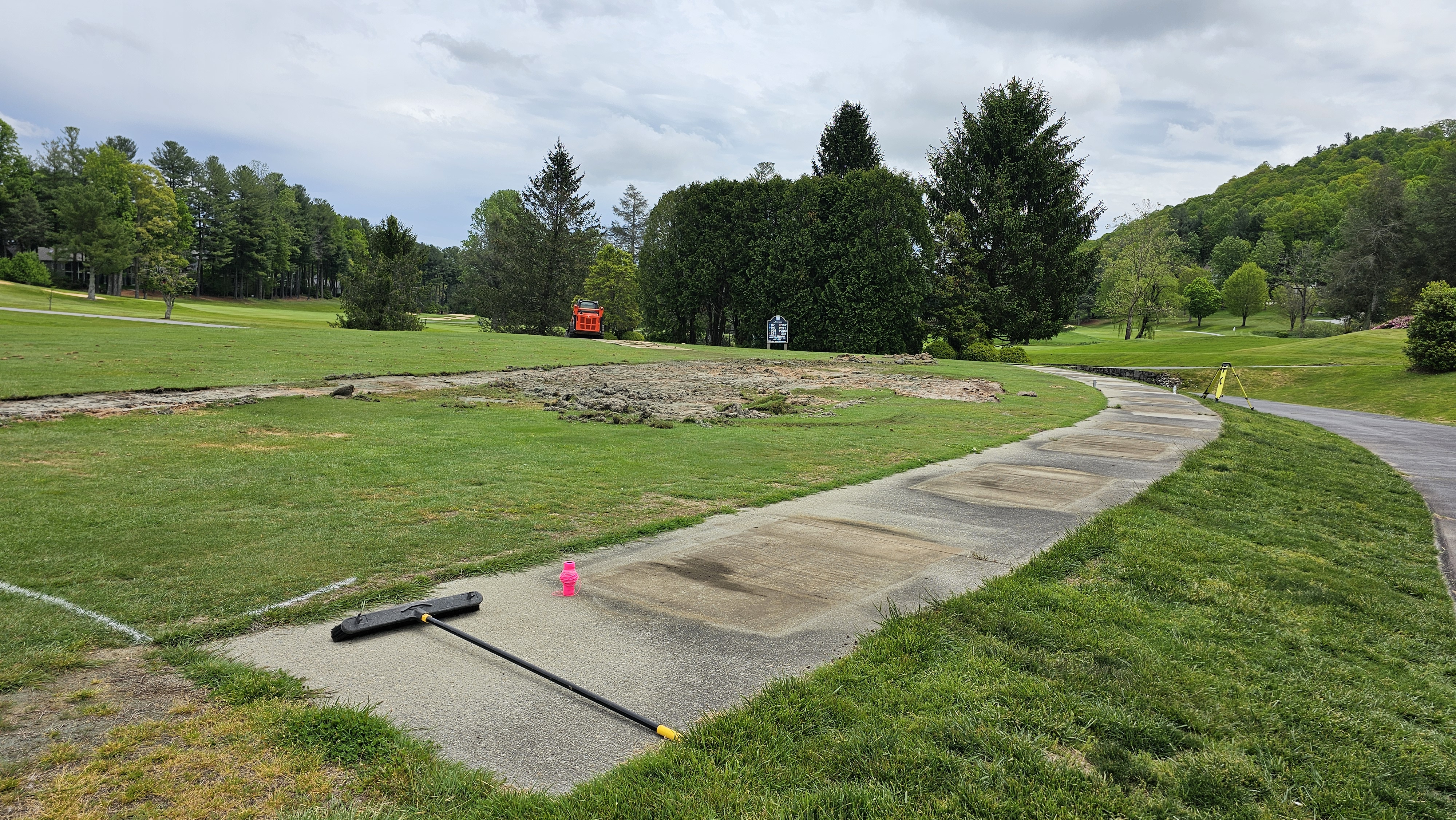 By mid-May, the new tee line took form as the concrete pad was poured - a sleek, level platform extending across the full width of the range. Once the slab cured, surrounding soil was regraded to match the original contours, and edge shaping began to integrate the new structure into the existing landscape.