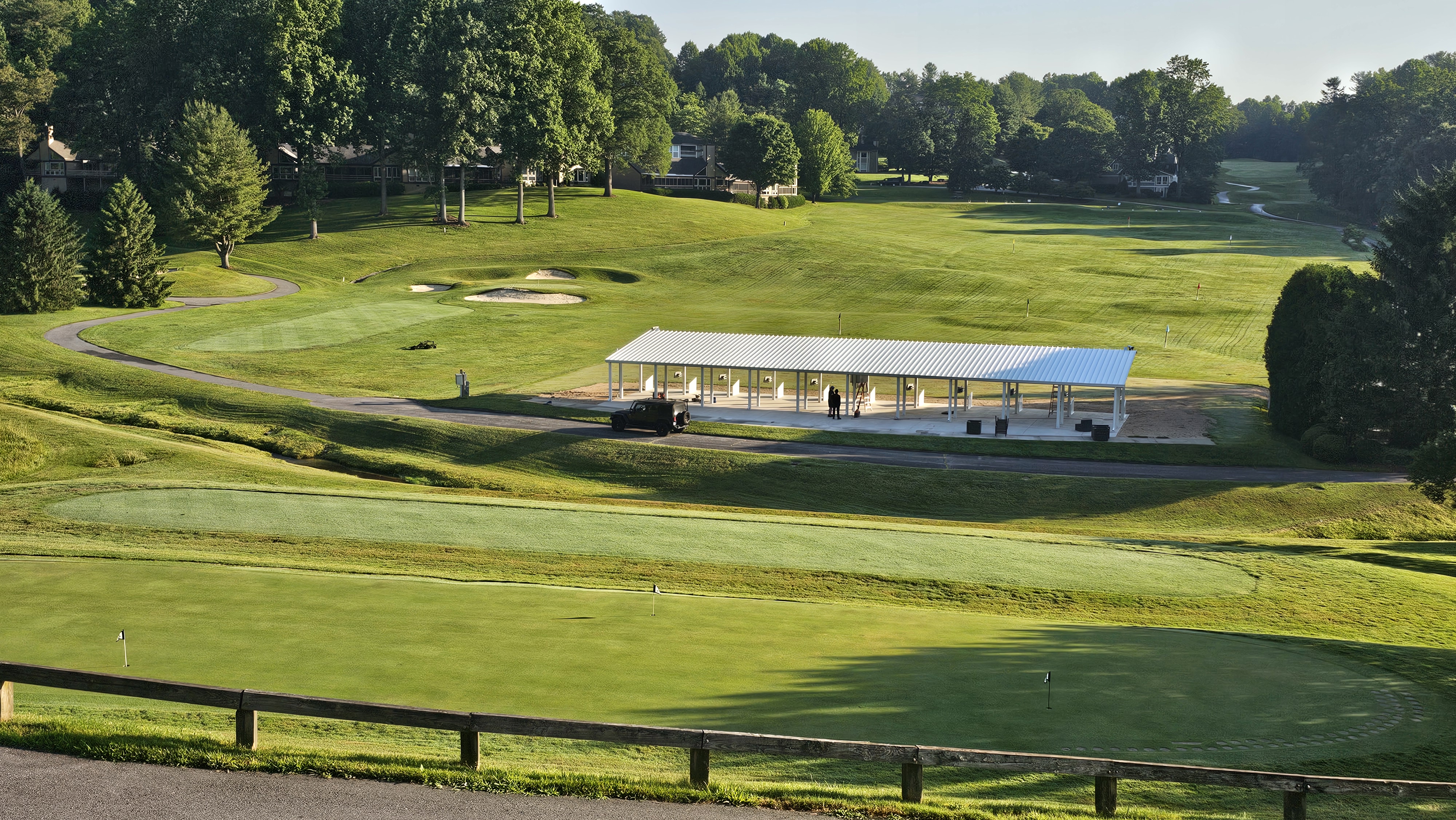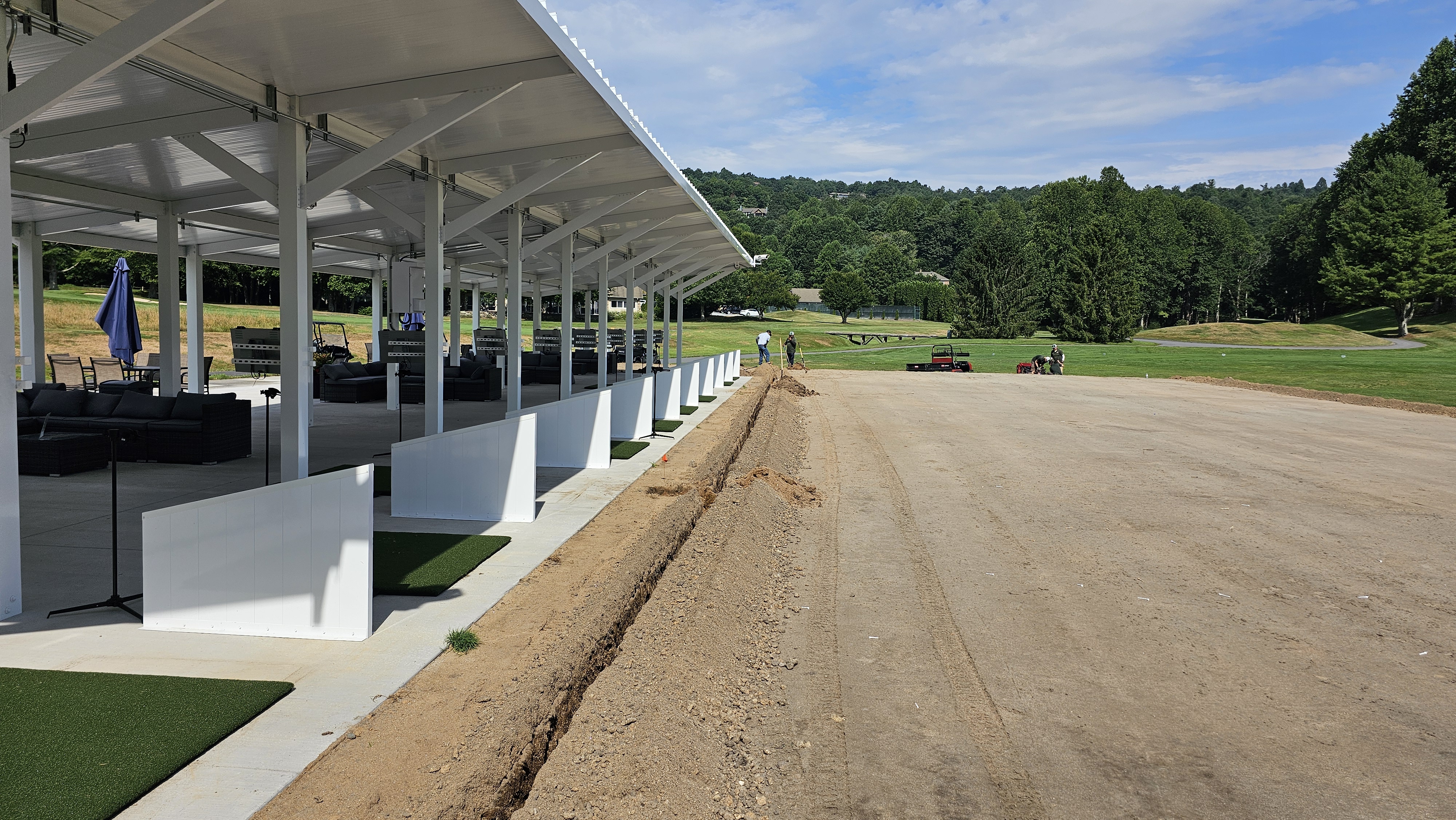 Early June marked the vertical transformation of the project. White steel framing rose over the new concrete pad, forming the canopy that would shelter golfers from sun and rain. Crews completed the structural assembly, wired electrical lines, and prepared for Toptracer technology installation.