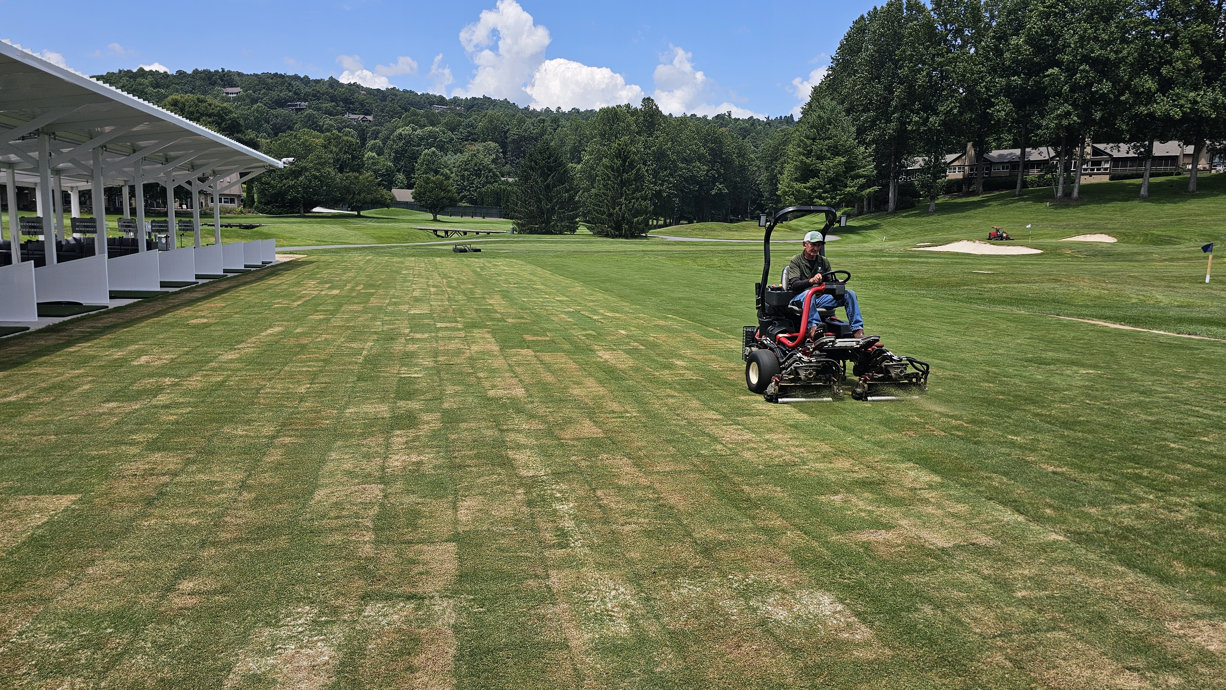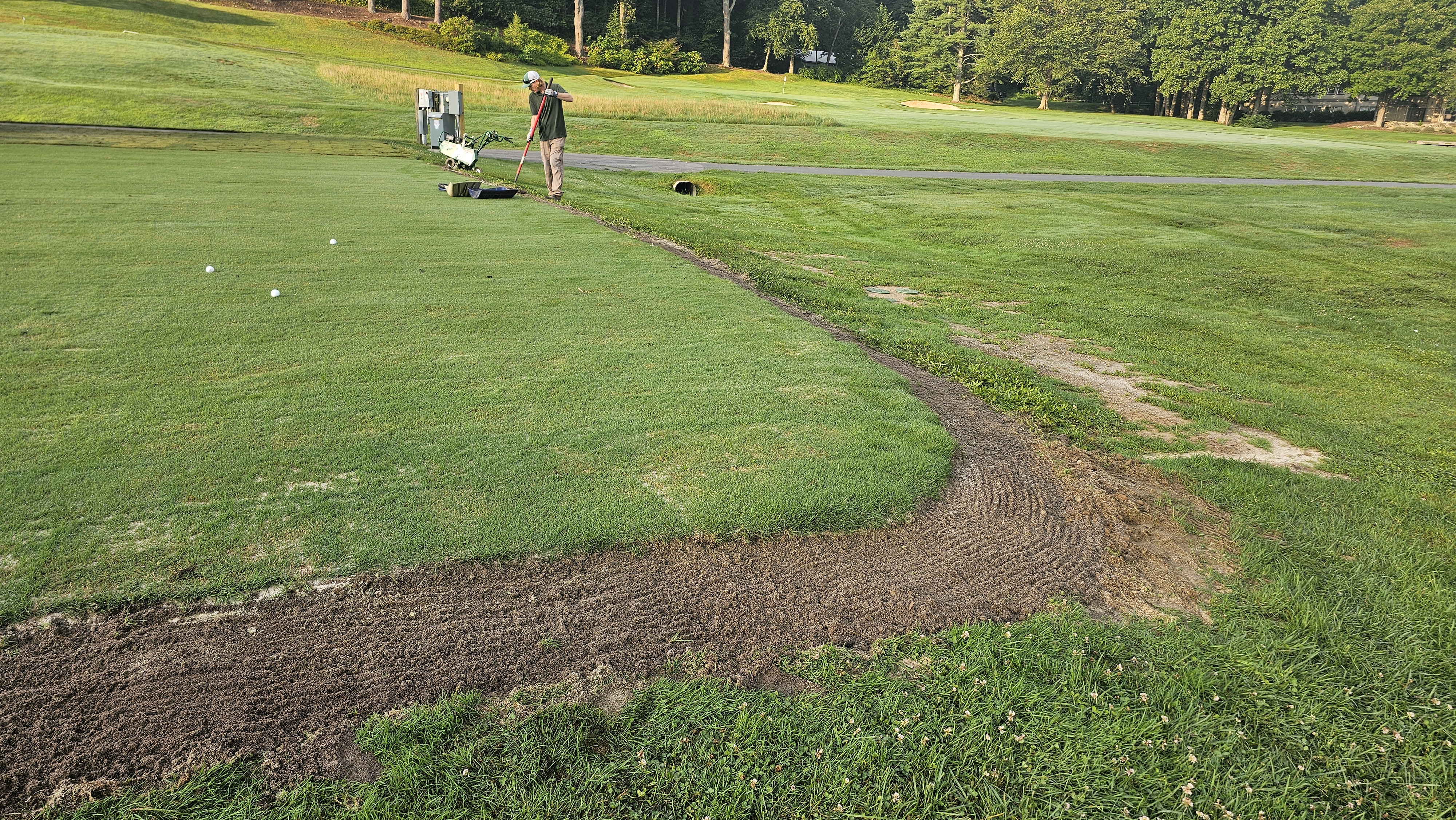 During the grow-in phase, maintenance crews mowed, topdressed, and rolled the turf in crisp grid patterns to promote density and smoothness. By mid-August, the turf displayed a deep green hue and healthy uniformity - a clear sign that the new range surface had fully established.