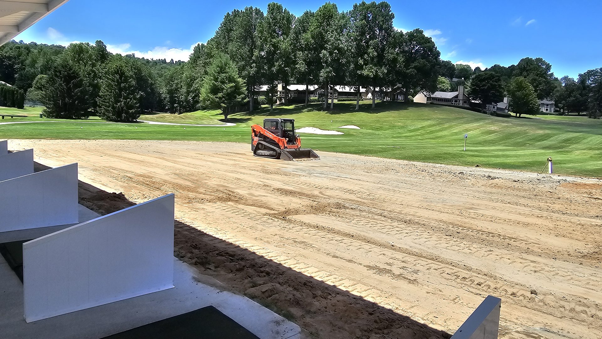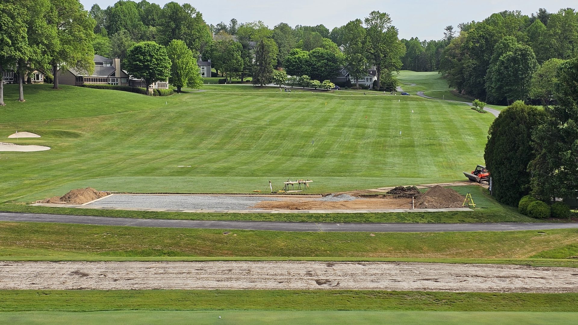 By early May, laser-guided grading was underway to shape the tee line pad. The base layer of gravel was compacted to exact specifications, creating a stable foundation for the concrete slab that would become the hitting platform. The range targets remained visible in the distance - a reminder of how the new technology would soon enhance a familiar practice setting.