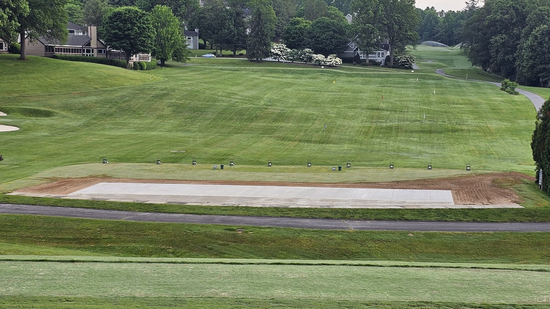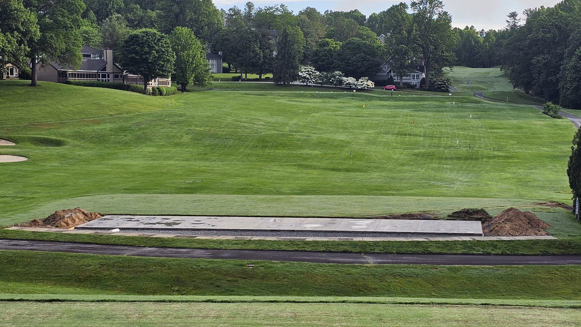 By mid-May, the new tee line took form as the concrete pad was poured - a sleek, level platform extending across the full width of the range. Once the slab cured, surrounding soil was regraded to match the original contours, and edge shaping began to integrate the new structure into the existing landscape.
