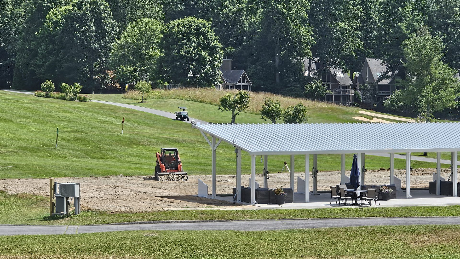 Early June marked the vertical transformation of the project. White steel framing rose over the new concrete pad, forming the canopy that would shelter golfers from sun and rain. Crews completed the structural assembly, wired electrical lines, and prepared for Toptracer technology installation.