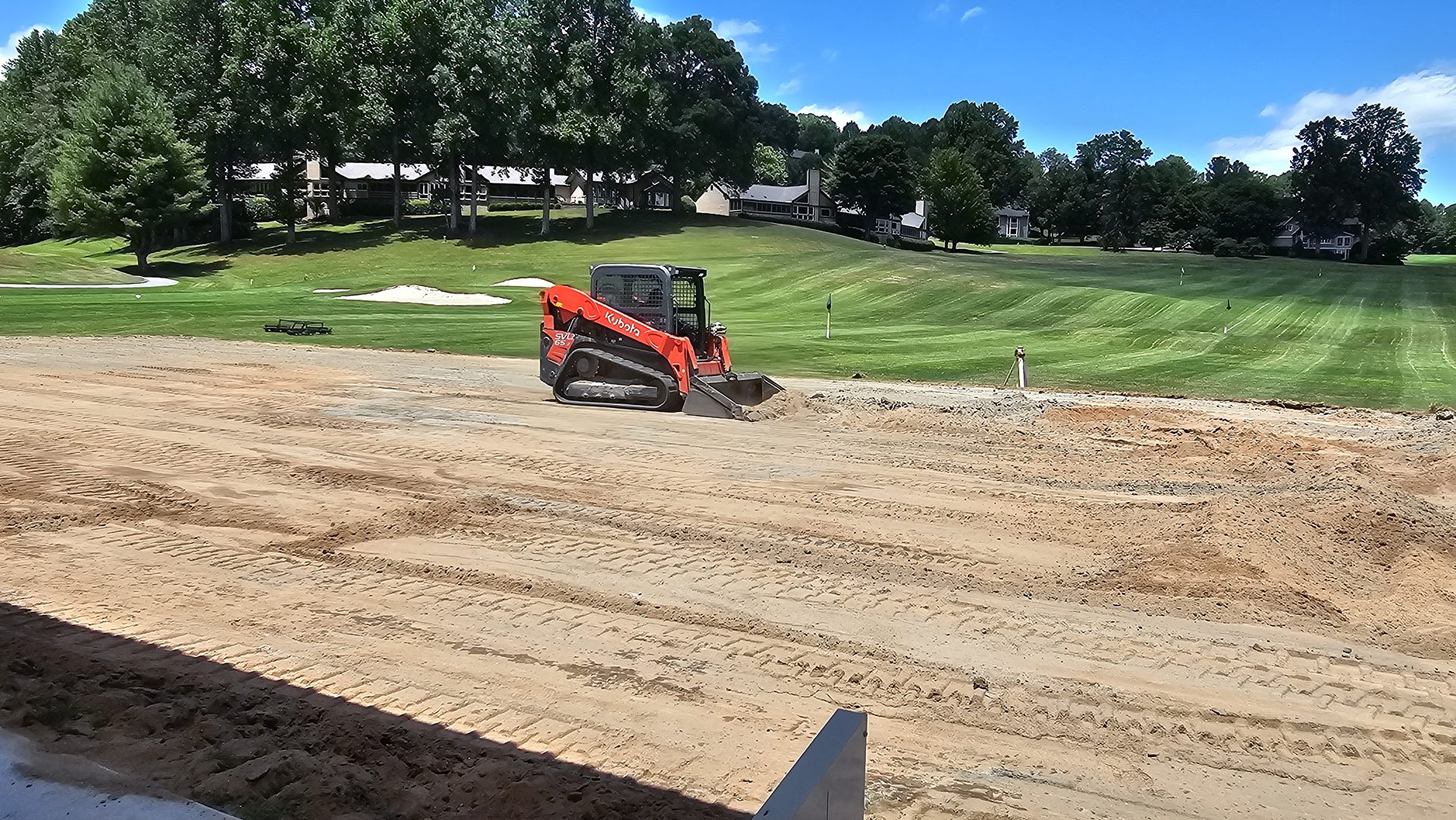 A Kubota track loader worked along the tee front to fine-grade the soil after backfilling the irrigation trenches. The precision of this work was crucial - it tied the new system seamlessly into the existing range layout while preparing the area for sod installation.