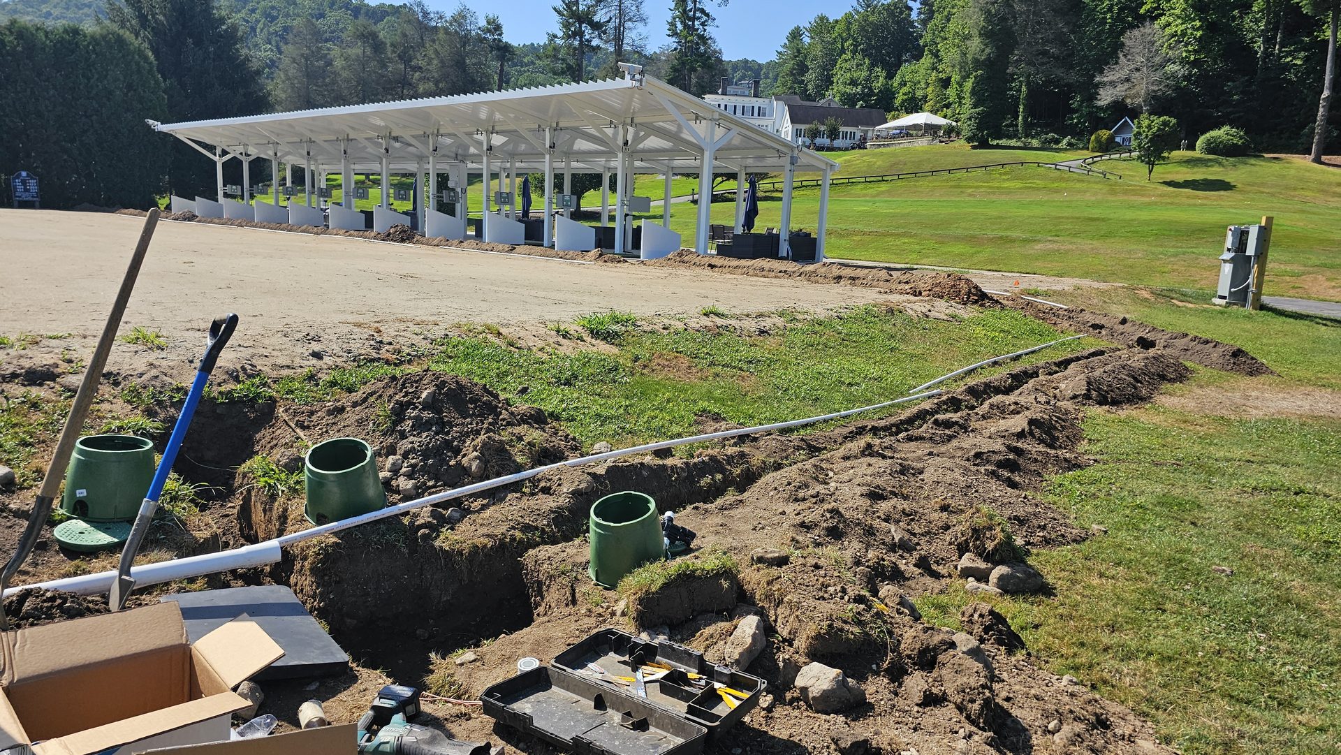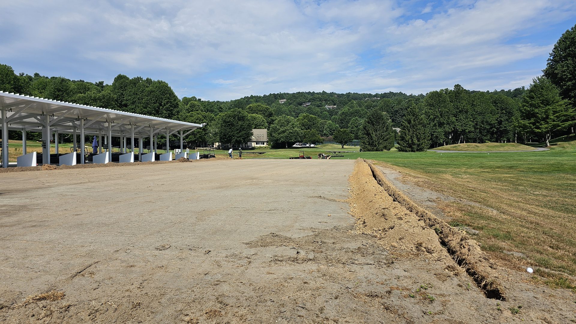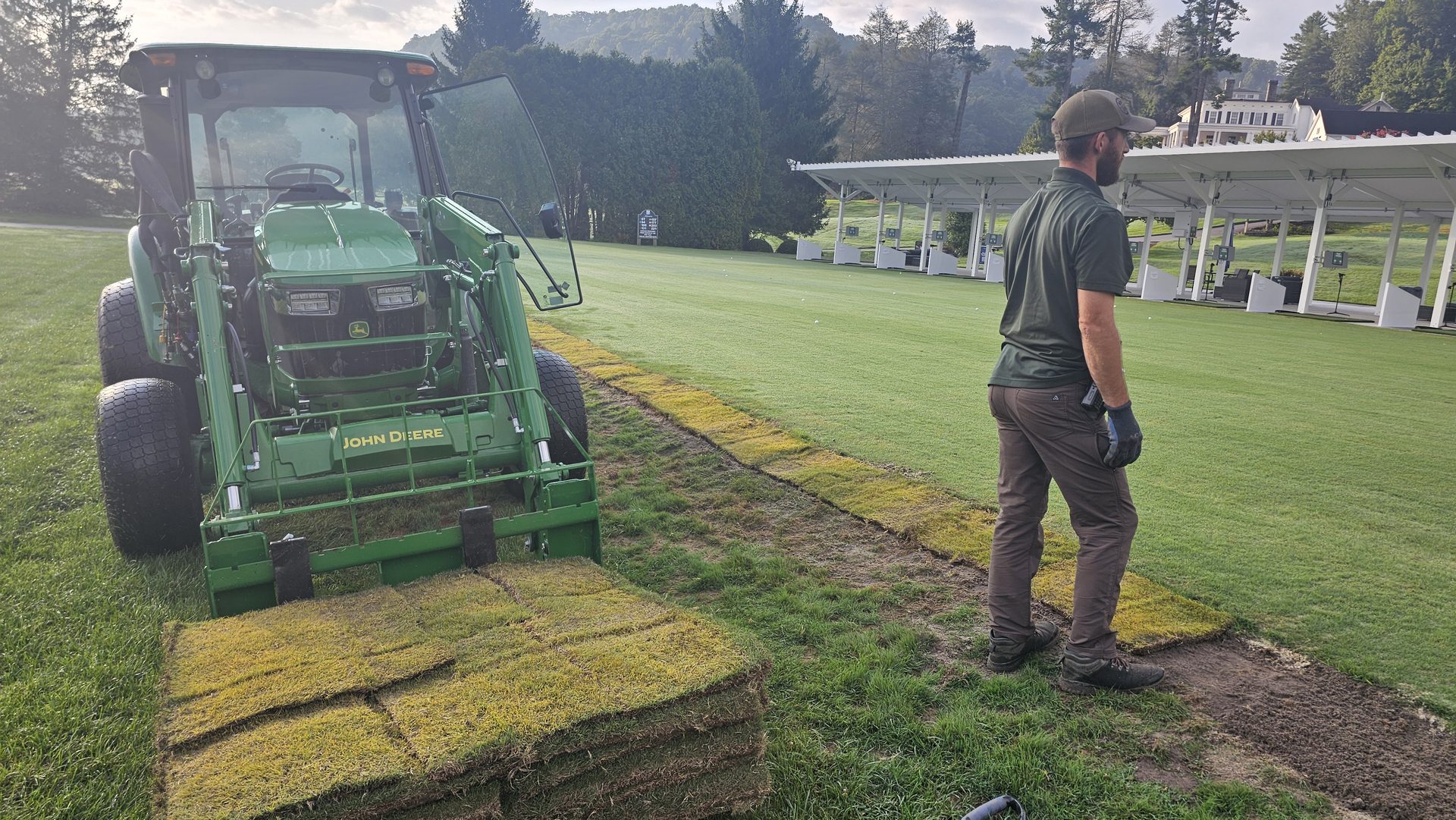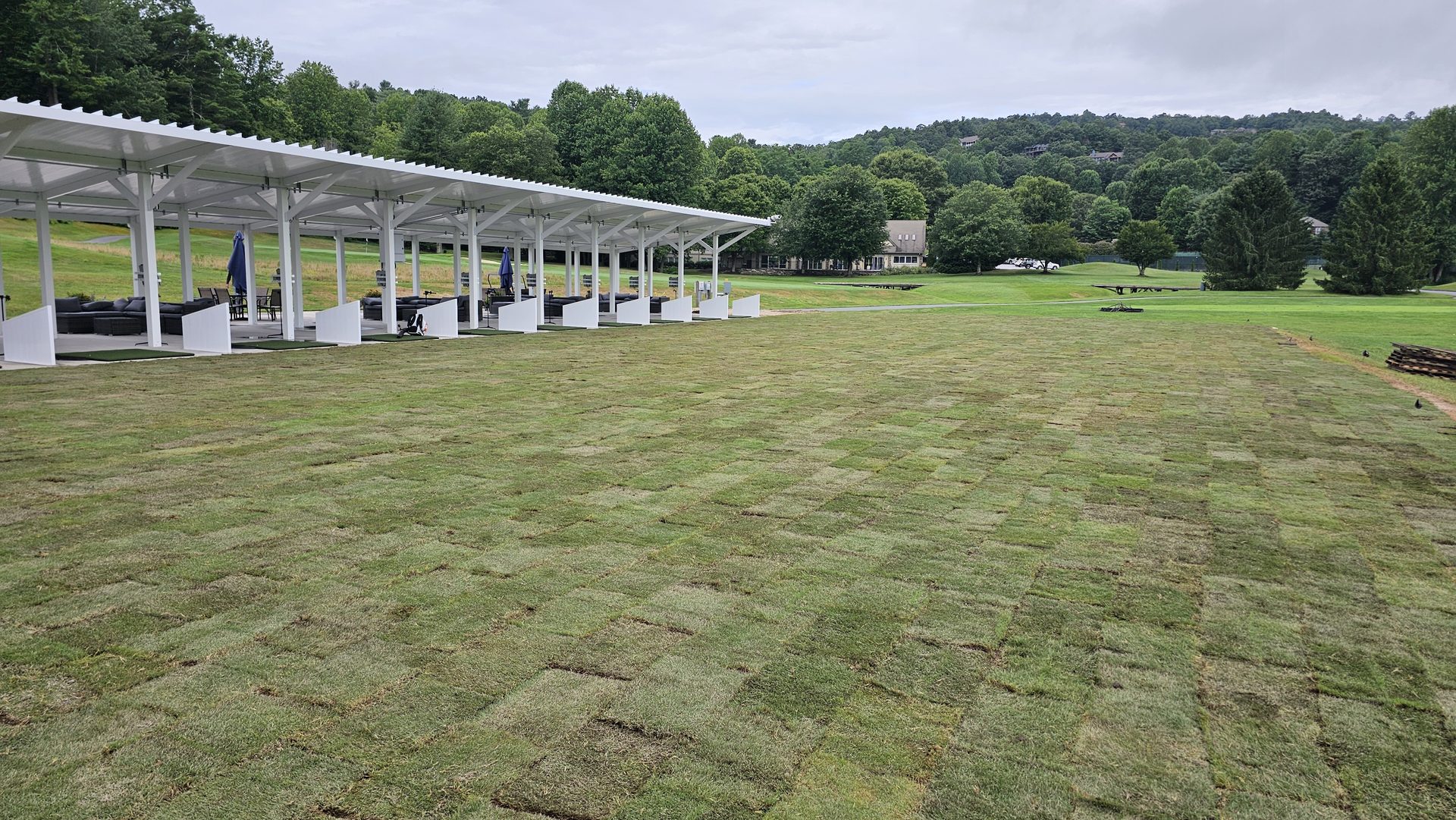 With irrigation operational, the final landscaping began. Fresh sod was installed along the front of the range and around the hitting bays, knitting the new construction into the natural contours of the property.